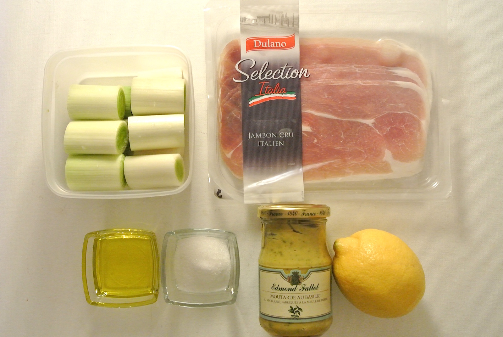 用意するものは、生ハムと白ネギ。マリネ液用にオリーブオイル、レモン、砂糖、マスタード。全部で6点、たったこれだけ!