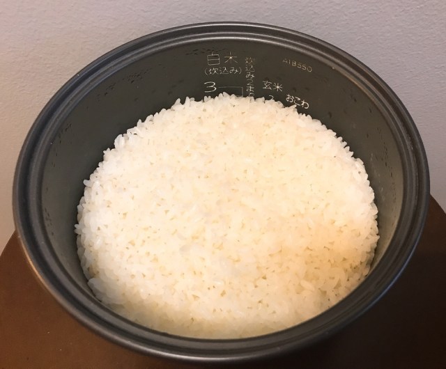 善は急げとばかりにさっそく白米2合を研ぎ、箱に記載されているとおり、やや少なめの水を入れてスイッチオン。通常の量よりも2~3ミリほど、水を少なくしてみました。