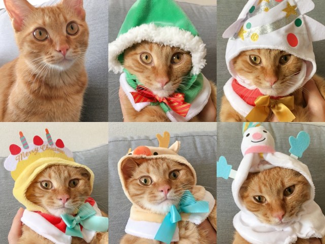 5種類かぶせてみた結果、茶白のつーちゃんに1番似合うのはもちもち感が増す「サンタ」。
