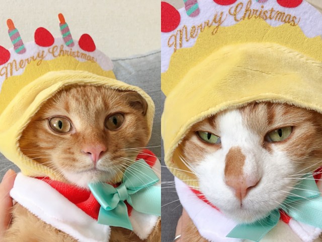 黄色が基調の「クリスマスケーキ」は茶白・茶トラ共になじみカラーでよく似合いました。がしかし、ラブリーなモチーフと対照的に兄猫は遠くを見つめた虚無顔に……。かぶりもののウェイウェイ感と絶望的な表情のギャップがすごいです。