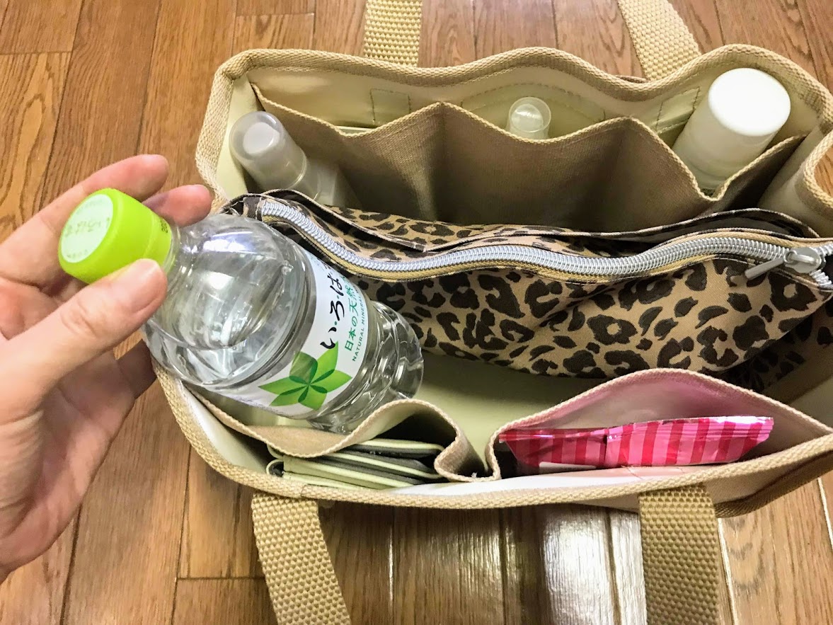トートにポーチを取り付けた状態で、長財布・ミニ財布・・ミニペットボトル・スマホ・ICカード・名刺入れ・化粧品。・ヘアオイル・化粧水ミスト・汗拭きシートを入れてみましたが、まだまだスペースがあって嬉しい悲鳴をあげてしまいました。