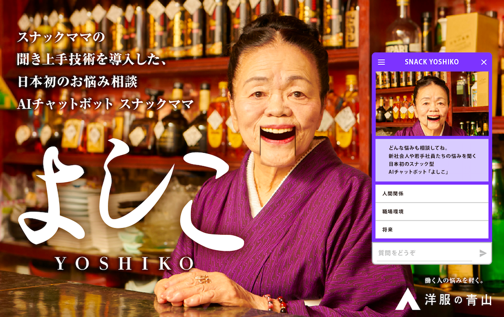 2021年7月7日から洋服の青山公式サイトで公開された、無料チャットボット「よしこ」。