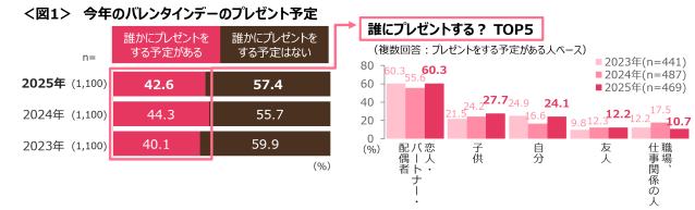 この割合自体は2024年とほぼ同じなんですが、変化があったのはプレゼントの相手。「職場、仕事関係の人」が減少し、「恋人・パートナー・配偶者」「子供」「自分」へのプレゼントが増加しているそうですよ!