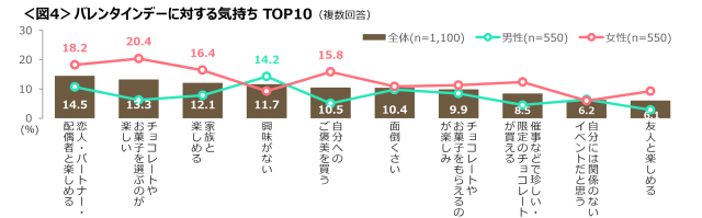 さらにバレンタインデーに対する気持ちについて尋ねてみると、女性は「チョコレートやお菓子を選ぶのが楽しい」「恋人・パートナー・配偶者と楽しめる」「家族と楽しめる」などワクワクするポジティブな気持ちある様子。