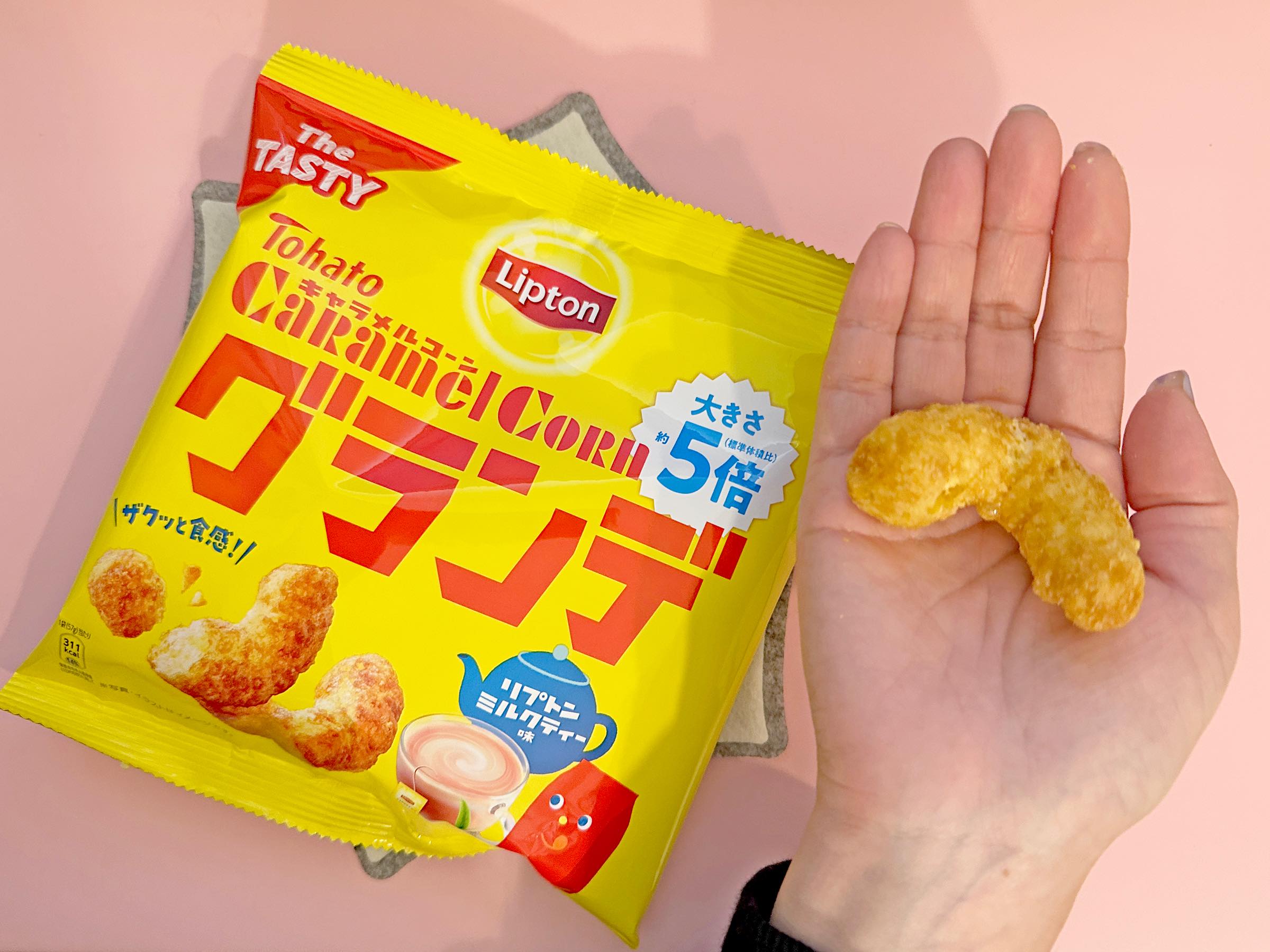 でっっっっっか。思ってた以上に大きかったです。頬張ると、いつものキャラメルコーンの向こう側からリプトンのミルクティーの風味がこんにちは! ガリザクッとした歯ごたえも楽しめます。