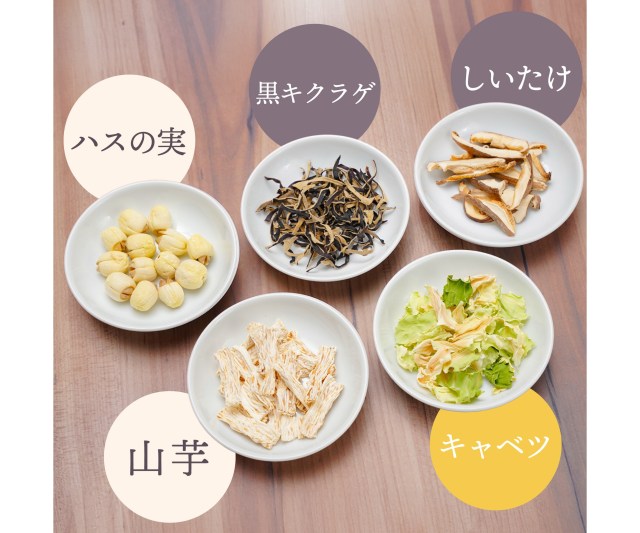白(ハスの実、山芋)、黒(黒キクラゲ、しいたけ)、黄(キャベツ)という3色・5種類の野菜をブレンド。不足しがちな「うるおい」を与え、不安定さを整えられるような食材が選ばれているそう。