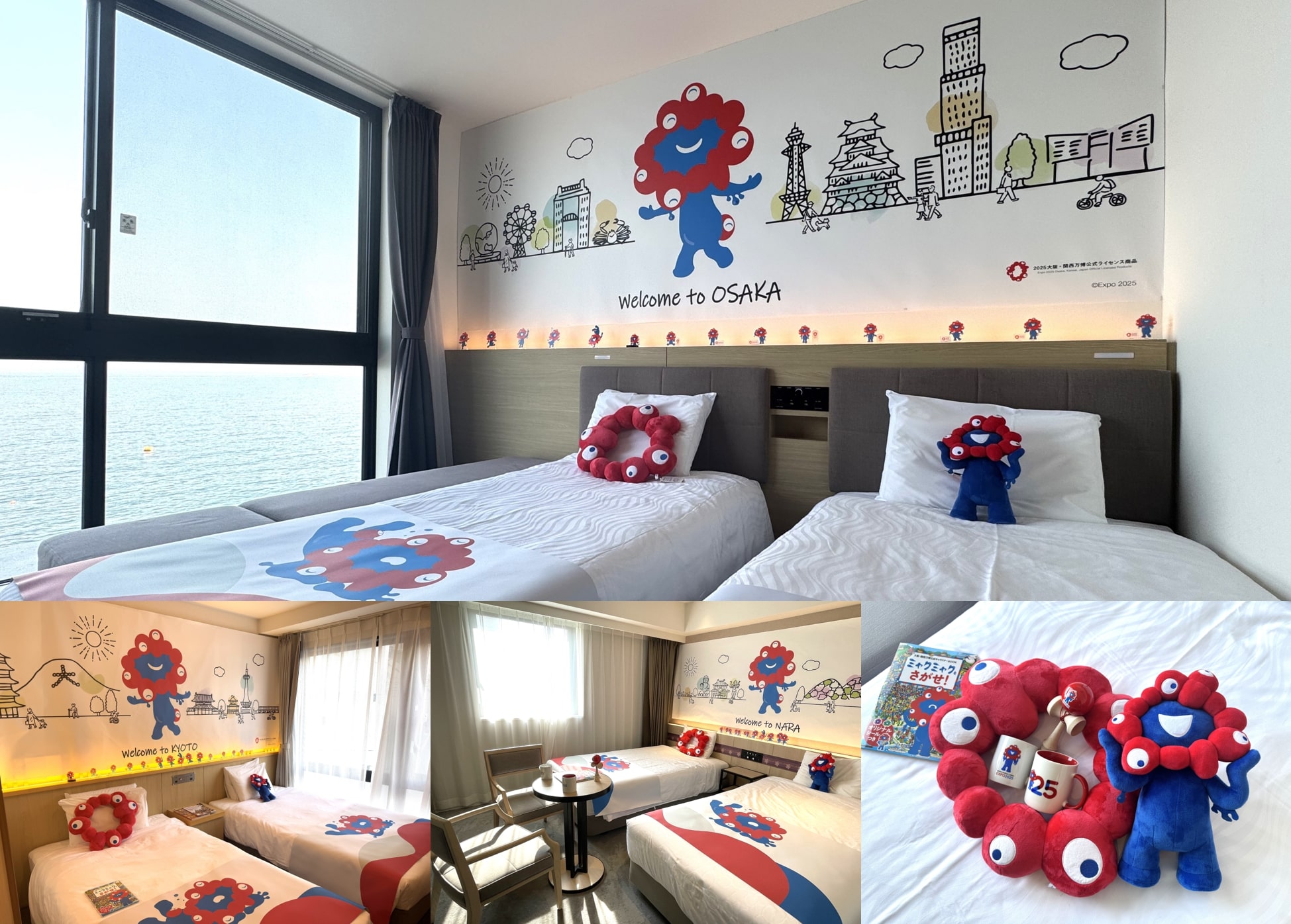 2025年4月13日から開催される大阪・関西万博の公式キャラクター「ミャクミャク」とコラボした宿泊プラン。壁や寝具にミャクミャクのデザインを施しているほか、ミャクミャクのぬいぐるみやアクスタなどのグッズも取りそろえています。個人的には、お部屋においてあるという書籍「ミャクミャクを探せ」が気になりすぎる。