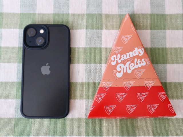ハンディメルツは、ピンクとレッドを基調とした三角形のボックスで到着。大きさは、手持ちのスマホ(高さ13.5cm)より少し大きいくらいです。
