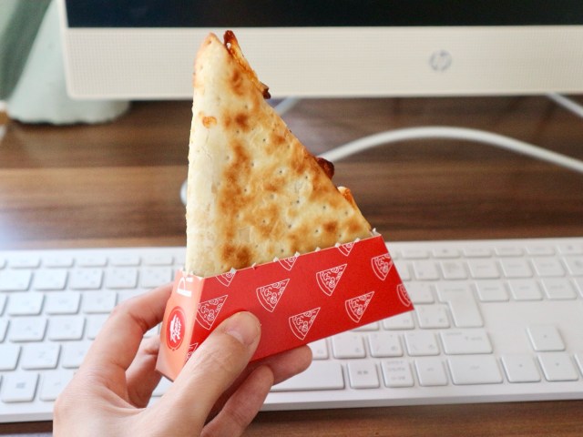 注意したい点は、ピザがサクサクなので、食べすすめるうちに欠片がホロホロとこぼれやすいところ。デスクでいただくなら、ティッシュを1枚ひいたり対策をするとよいかもしれません。