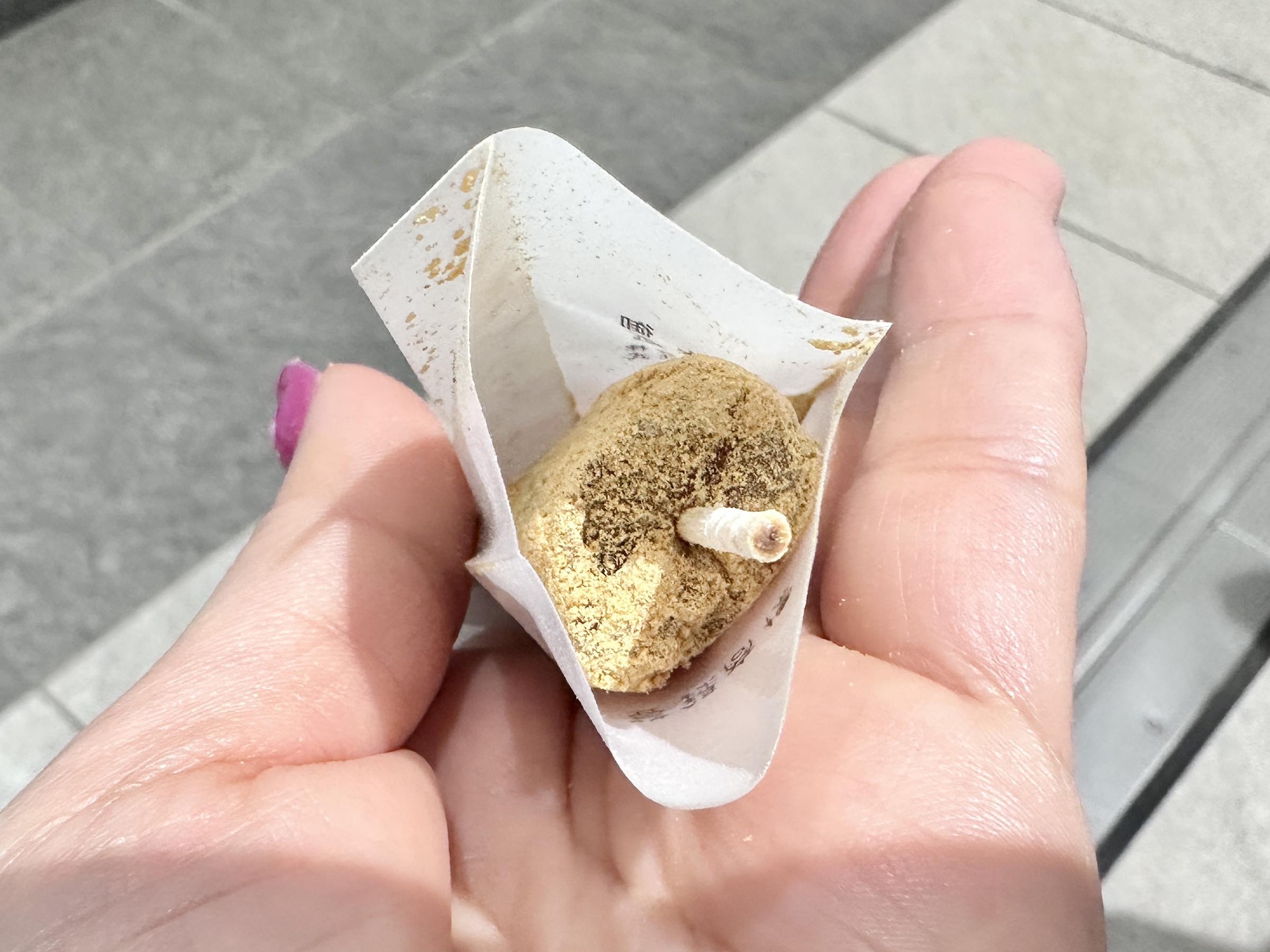 「川通り餅」は爪楊枝に刺さったひとくちサイズのお餅に、たっぷりときなこがまぶされたお菓子。お餅好き・きなこ好きなら、このルックだけでテンション上がること間違いなし。