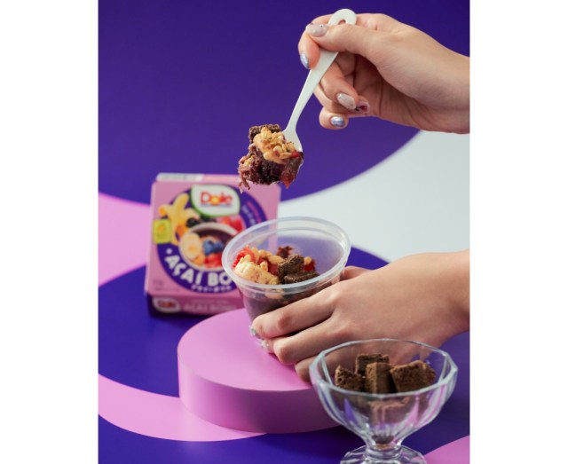 「Dole アサイーボウル」は、南アメリカのブラジル原産のアサイーで作った濃厚でなめらかなスムージーにストロベリー、ブルーベリー、バナナといった冷凍フルーツをトッピングし、後乗せのグラノーラでザクザク食感を加えているのが特徴だそう。