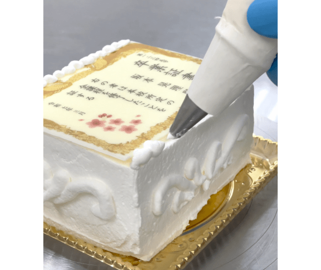 こちら、感謝の気持ちを込めたメッセージ入りの賞状が天面に乗ったデコレーションケーキなんです!