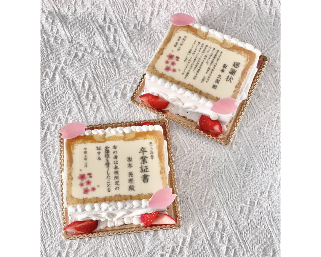 「感謝状ケーキ」「卒業証書deデコレーションケーキ」は約4号サイズ(直径約12cm×幅約9cm)で税込み2800円。予約限定商品ですので、利用日の1週間前までに千葉県匝瑳市の「お菓子のたいよう」店舗に来店または電話してお問い合わせください。