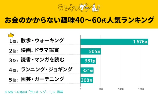 ランキングサイト「ランキングー!」が40代以上の男女8444名におこなった「お金のかからない趣味 40~60代人気ランキング」調査。