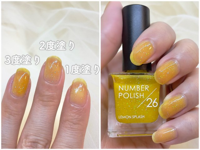 フレッシュなレモンカラーがこれからの季節にぴったり☆ 目を引くビタミンカラーですが、大粒の偏光ラメ&透明感の効果で想像以上に肌になじむ印象でしたっ。黄色推しさんにオススメしたい!