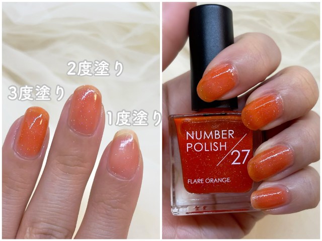 2度塗りではシアー感のあるオレンジ、3度塗りで華やかなブラッドオレンジを楽しめます。繊細ラメの作り出すきらめきがプラスされるので大人でも使いやすいビビッドカラーになっていました!