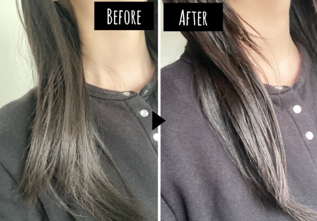 それでは、実際に髪の毛に使ってみましょう。寝起きにブラッシングしただけの髪の毛に「アリィー クロノビューティ UV ヘアカラーラスティング&スタイリング バーム」をなじませると……ややしっとりしたセミウェットな仕上がりで、広がっていた毛先が程よくまとまったではありませんか!