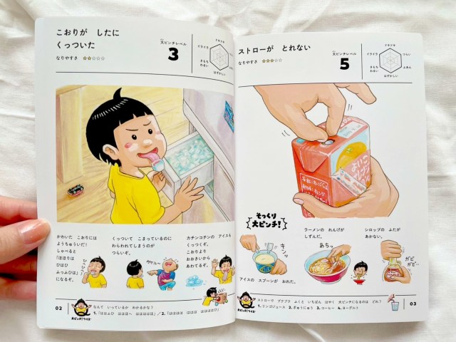 全24ページの中に18のピンチをたっぷり収録。「こおりが したに くっついた」「トイレの かみが ない」など毎日の中で起こりそうなあらゆるピンチを「なりやすさ」と「大ピンチグラフ」などで分析&解説しているので、いざという時にきっと助けになるはず!?