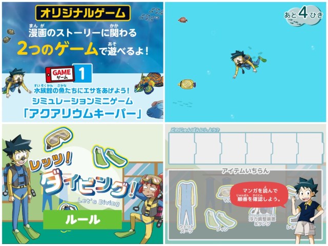 お話は水族館へ訪れたサバイバルの達人「ジオ」とジャングル生まれの少女「ピピ」が、水槽への潜水に挑戦! でも水族館の生き物は美しいだけじゃなく、危険もいっぱいで……!