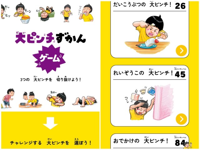 スマホを使って遊べるハッピーセット限定「大ピンチずかんゲーム」も超必見。「だいこうぶつの 大ピンチ」「れいぞうこの 大ピンチ」「おでかけの大ピンチ」の3種類のゲームがあり、それぞれ難易度を選んで遊べます。
