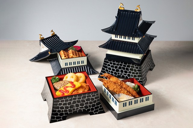 「お殿さま城ランチ」は1650円で販売中。オムライス、ハンバーグ、エビフライなどをお城型の三段重に盛り合わせた「お子さま城ランチ」(1320円・おもちゃ付き)も販売中ですので、親子で注文して城主気分を味わうのも楽しいかも!