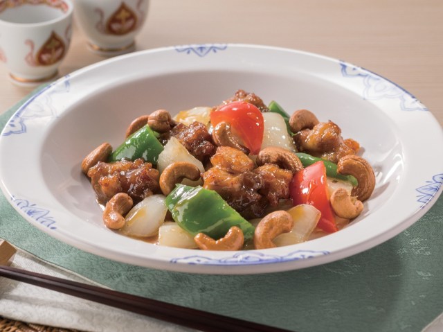カリッと揚げた鶏肉と醬油ベースの甘辛いソースが相性抜群♪ さらに生姜の香りがよいアクセントになっています。再現が難しい甘いカシューナッツは、砂糖と水で、ほんのり甘く仕上げてあるそう。