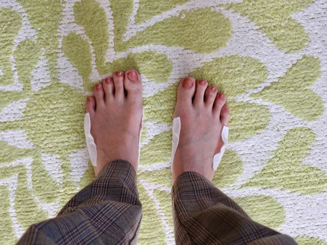 身体の重みでツボ押しが強化され、チクチク痛いのです。これはきっと、ツボに刺激がかかってるっ! 特に、伸ばしながら貼った右足が痛い~!