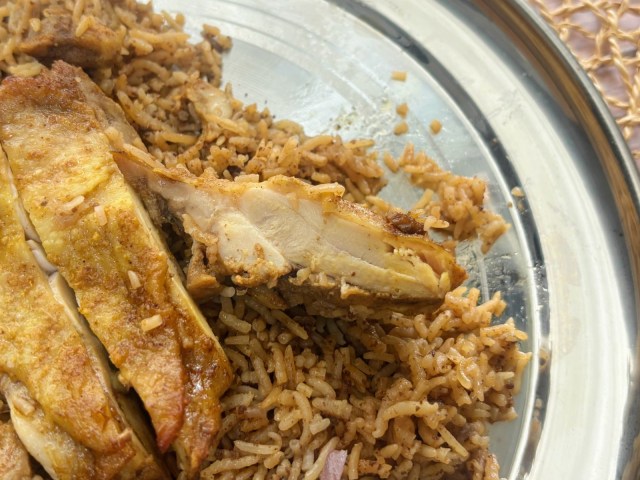 そして、鶏もも肉がまるまる1枚のっているのも豪華! しかもこのチキンにもスパイシーな味つけがされていて、チキン単体でもおいしくいただけます。