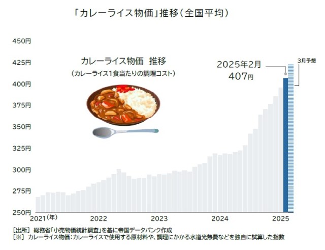 2025年4月10日におこなわれた発表によると、2025年2月分のカレーライス物価指数は1食407円となったそう。