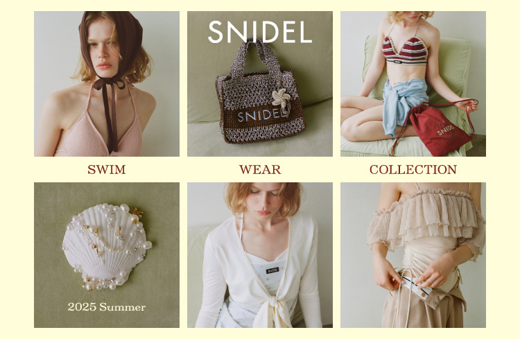 かわいくてオシャレな水着を探しているのなら「スナイデル」がいい感じ。ウエストリボンがキュートなビキニとショートパンツのセット、オフショルとしても着られるフリルワンピスイムウェア、クロシェ編みのホルターネックビキニなど、目移り必至のラインナップです。