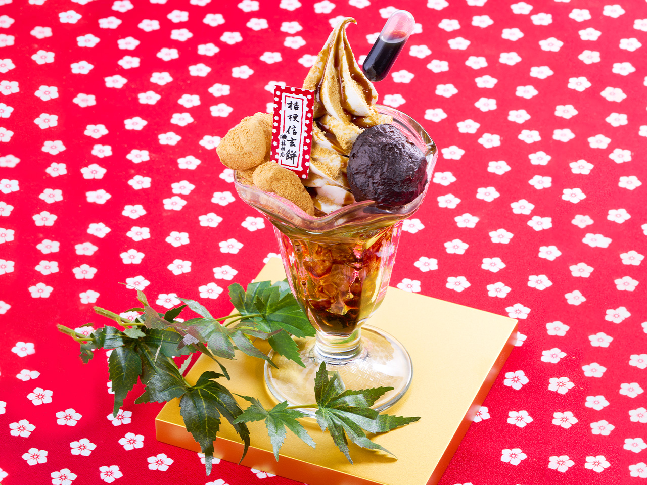 本家で使用されているきな粉+黒みつ+昨年の2倍のわらび餅を使用した “和テイストのパフェ” 。桔梗信玄餅と同じように、お好みで黒みつをかけながら楽しめる「追い黒みつスポイト」も楽しめちゃう!