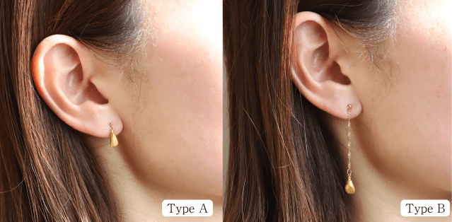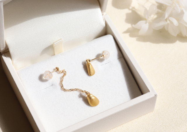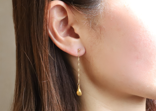 金乳歯部分はピアス、イヤリングともに純金(K24)製(ほかのパーツはK18)。選べるのは前歯のみですが、前歯はティアドロップのようでアクセサリーとしては馴染みやすい形だそう。不規則ながらも丸みを帯びたフォルムは、人工では生み出せない自然な美しさを秘めています。