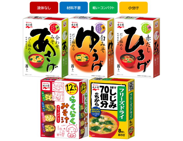 「あさげシリーズ」「らくらくみそ汁」「しじみ70個分のちからみそ汁」などバリエーションもありますので、好みや滞在日数に応じて持っていってくださいね!