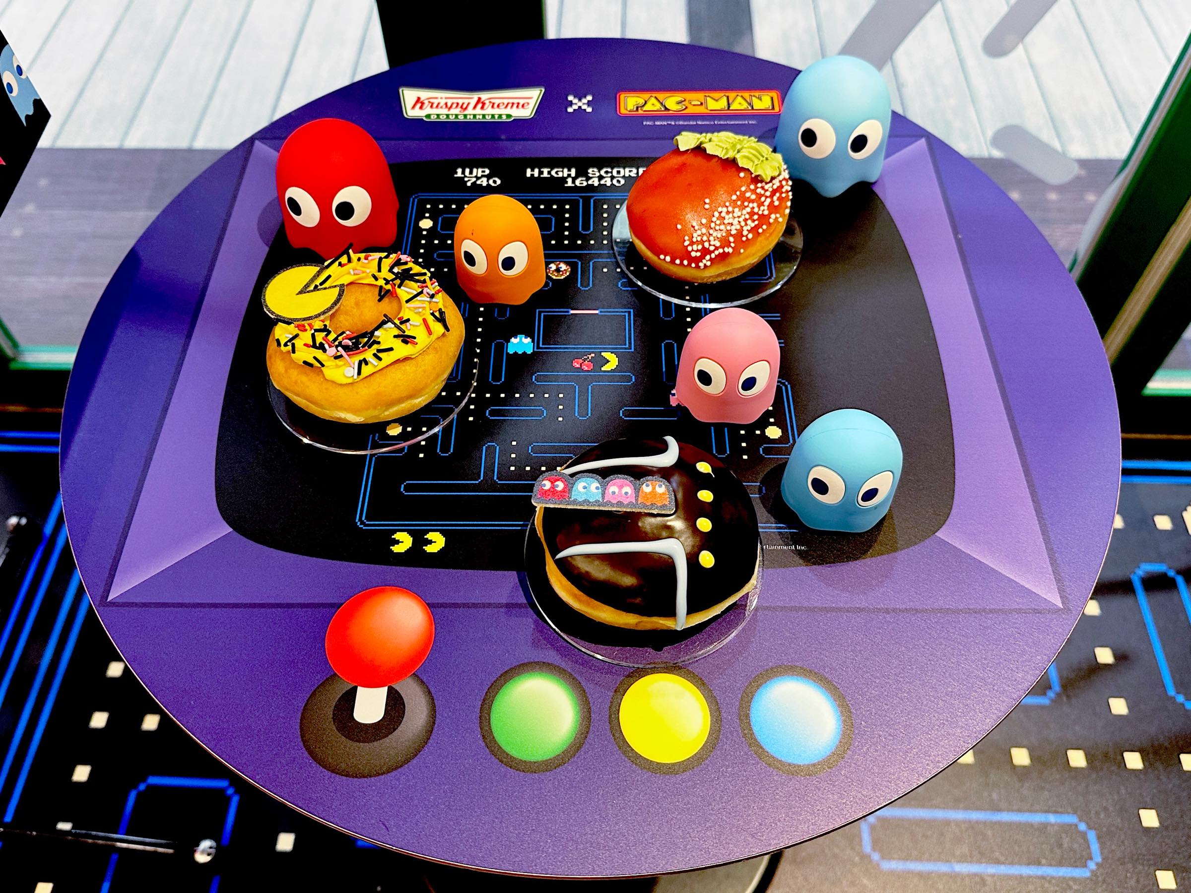 パックマンのゲーム画面とドーナツってこんなに相性良かったの?って思うほど、ポップなカラーとクリスピー・クリーム・ドーナツのカラフルな商品がベストマッチ。自分で食べるのはもちろん、ゲーム好きな人へのおみやげにも喜ばれそうなラインナップでした♪