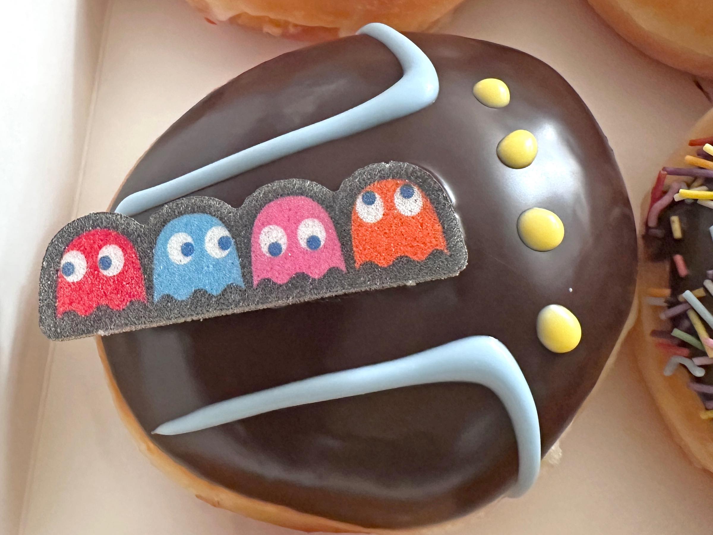 カラフルなスプリンクルで飾られたカスタード風味のクリームドーナツに、主役のパックマンがドーン! そういえば、パックマンって顔のイメージ強いですが本来はこんな見た目ですね!?