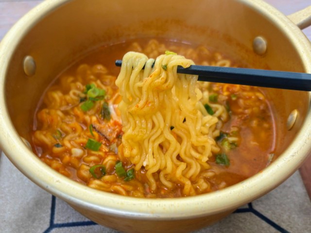 麺は韓国らしいもちもち食感で、スープとしっかりからんでいます。牛肉のような見た目のかやくが入っているのも楽しいですね。
