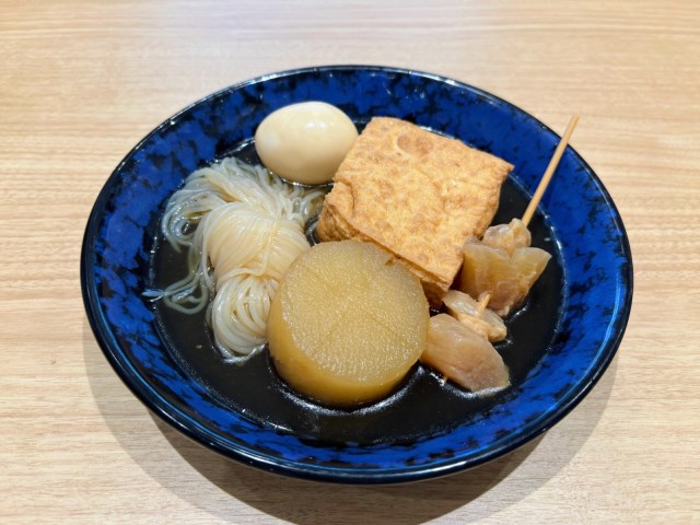 牛すじ、だいこん、たまご、厚揚げ、しらたきの5種。どれも出汁がしみしみで、うどん同様、心がほっとする味わい♪ 大根は箸でスッと切れるほどにやわらかです。