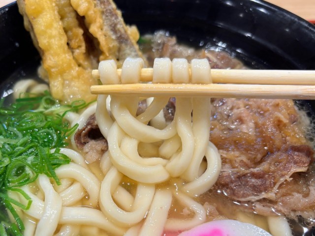 サバや昆布、シイタケからとったという出汁は、甘じょっぱい味つけの薄切り牛肉やカラッと揚がったスティック状のごぼ天にも染み込んでいて、こちらも美味。うどんだけでなくトッピングもふくめて全体で楽しめる1杯になっています。