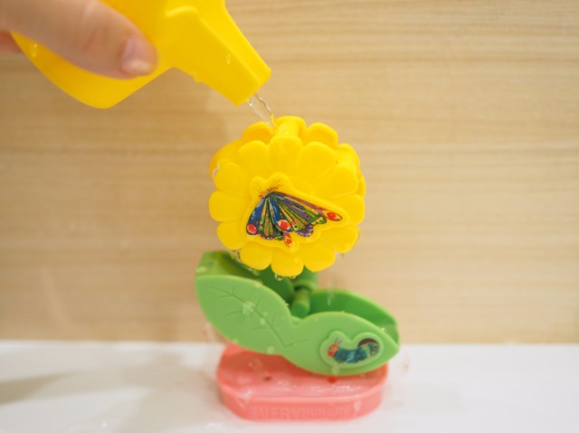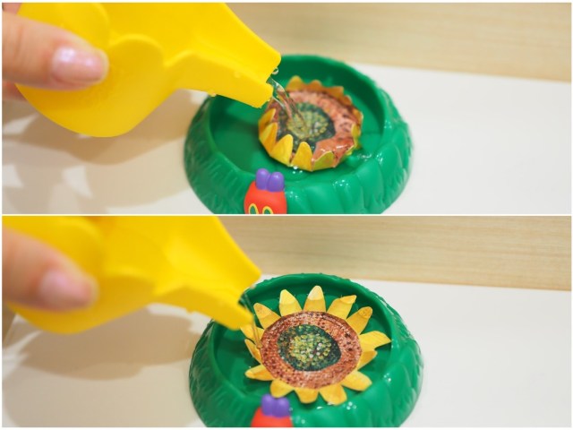 ひまわりの形がかわいい水車のおもちゃです。ひまわりにはあおむしやちょうちょの姿も発見、絵本の美しさも感じられます♪