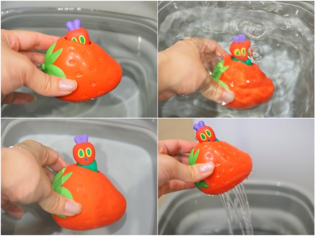 いちごを水の中に入れると、ブクブク空気を出しながらあおむしのお顔がでてきます。いちごは持ち上げるとシャワーに変身! 次々と変化を楽しめるおもちゃでしたっ。