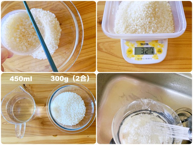 付属の計量カップでお米を測ってみると多少の誤差はありましたが、レシピ通りに2合分(米300g、水450ml)で炊飯してみることに。