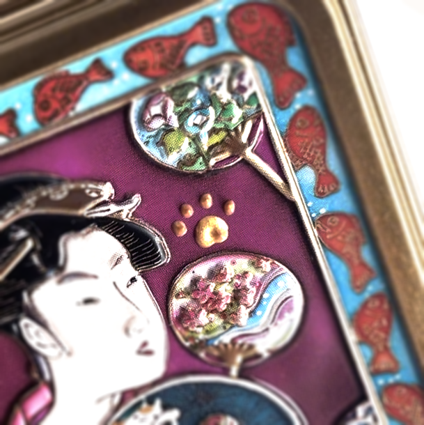 江戸の水茶屋の看板娘・おひさを描いた喜多川歌麿による美人画を “ガラス絵” で再現。ちなみに、この美人画をプロデュースしているのは蔦重です。