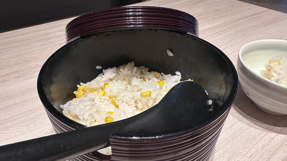 おひつで用意されていたご飯は夏に食べたい「とうもろこしご飯」で、開けた瞬間思わず「きゃあ〜っ」と大歓声。お味噌汁もポットに入った状態で運ばれてくるので、ちゃんと温かいままいただけます。
