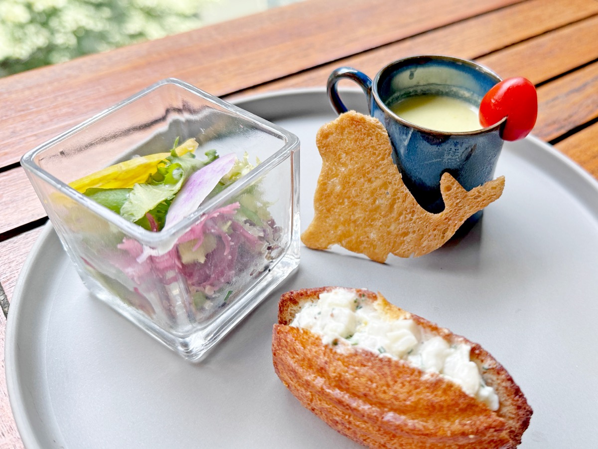 まずはセイボリーのプレートから。ホタテ貝のタルタルは「マドレーヌってそういえば貝型だった」と気づかせてくれる1品。塩気のきいたマドレーヌ、セイボリーとしてめちゃくちゃ美味しい!