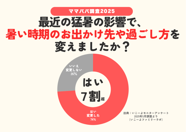 それによると、猛暑を予想して約74%の子育て世帯がお出かけスタイルを変更したと答えたそうなんです!