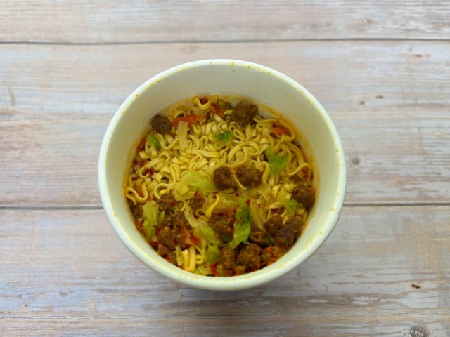 具材はフリーズドライのキャベツ、肉そぼろ、にんじん、唐辛子。目立った特徴があるわけではないですが、それが逆にスープを邪魔することがなくてよいと個人的には感じました。