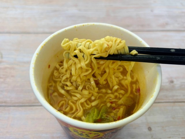 赤色の唐辛子の粒が浮いてはいますが、スープ自体は黄や茶に近い色。カレーヌードルらしいといえばらしいですが、激辛かどうかは疑わしくなってきちゃいました。