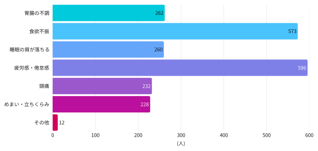 具体的な症状としては、1位「疲労感・倦怠感」、2位「食欲不振」、3位「胃腸の不調」、4位「睡眠の質が落ちる」という結果となりました。