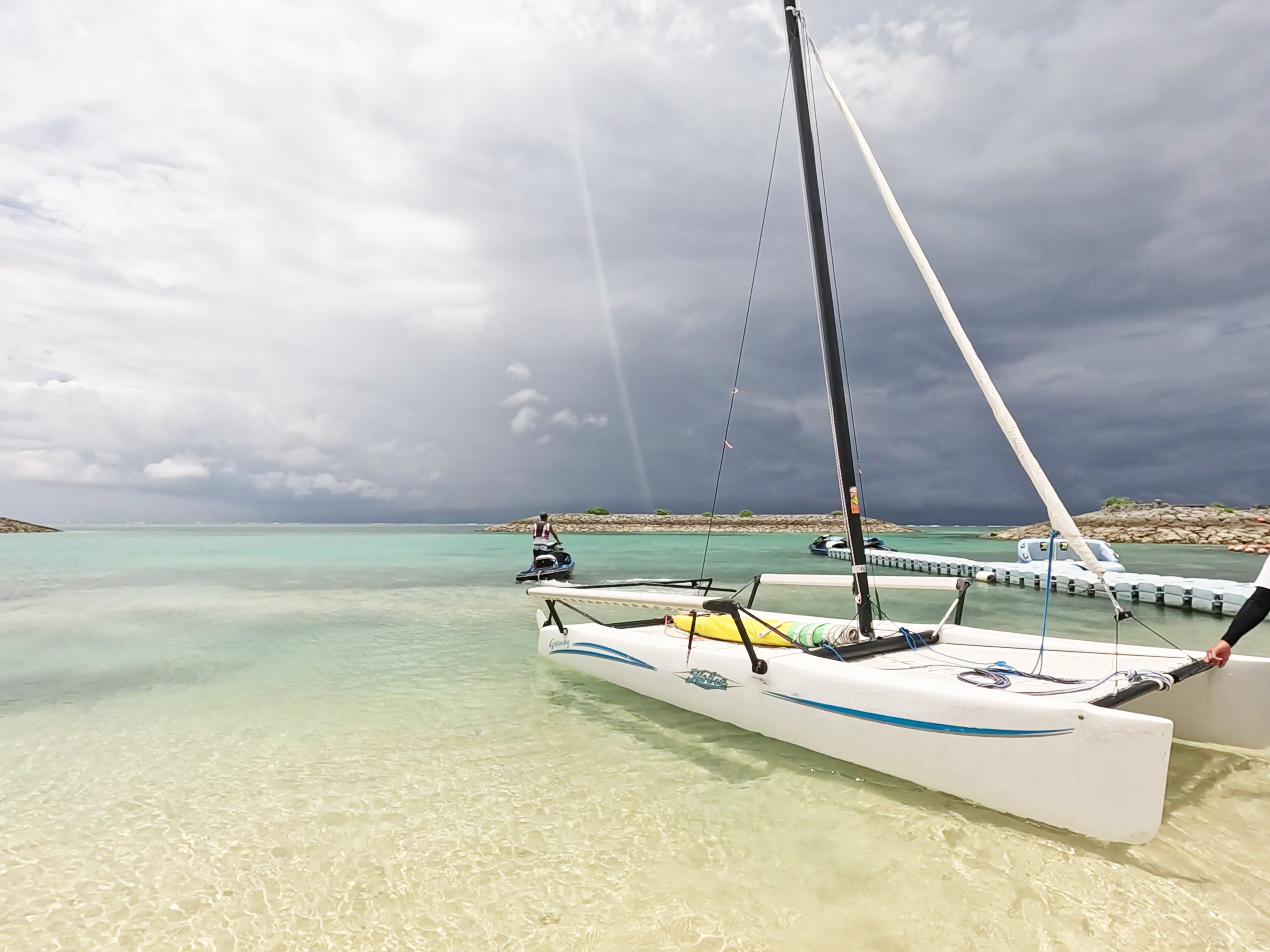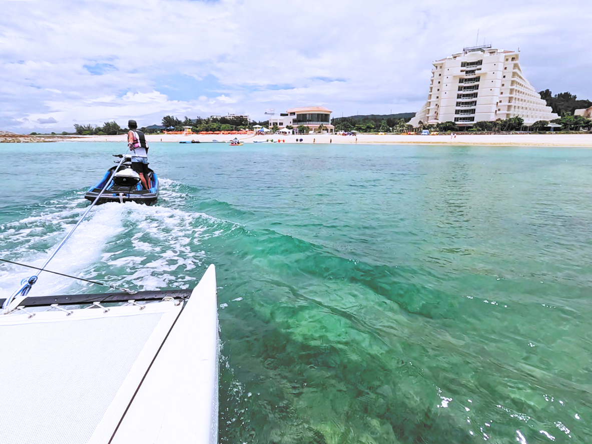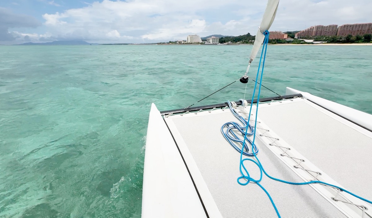 シェラトン沖縄サンマリーナリゾートにはたくさんのマリンアクティビティが用意されていますが、その中で私が体験したのはワンショットプログラムのひとつ「ヨットクルージング」。風の力だけで進む、全長5.5mの小型カタマランヨットのセイリングクルーズです。
