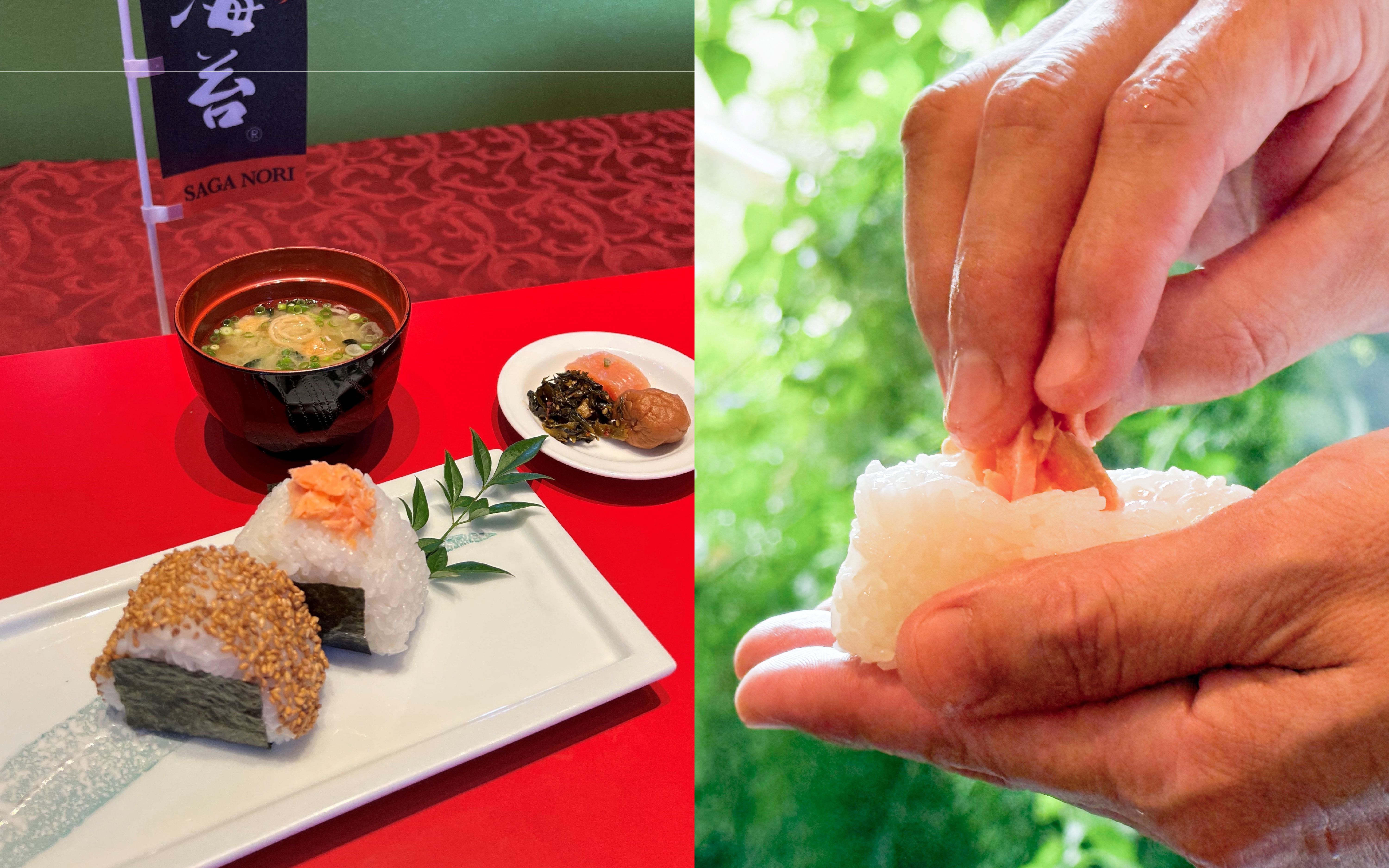おむすびには、ふっくら甘い「佐賀県産ひのひかり」×お米のおいしさを引き立てる「佐賀海苔」を使用。具材は「鮭」と「塩胡麻」の2種類のみと、極めてシンプル!!